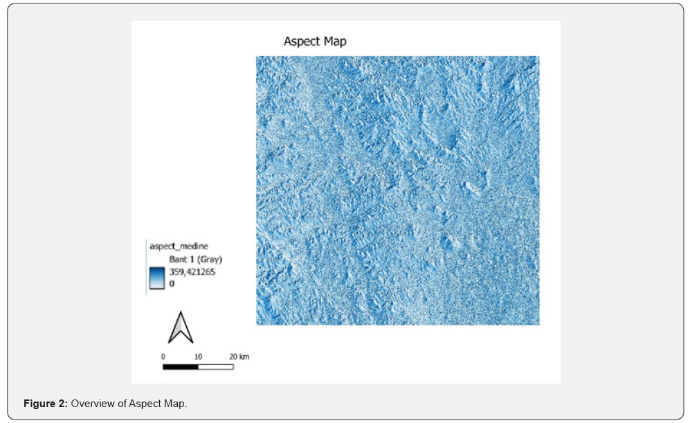 Topographic parameters such as slope and aspect are fundamental to hydrological modeling, land suitability assessments, and ecological studies [10] (Figures 2 & 3). In this study, slope and aspect layers were derived from the ALOS DEM. The slope indicates the rate of elevation change, while aspect identifies the directional orientation of slopes, both of which influence runoff behavior, insolation, and vegetation distribution. These parameters serve as essential inputs for modeling spatial drought variability.