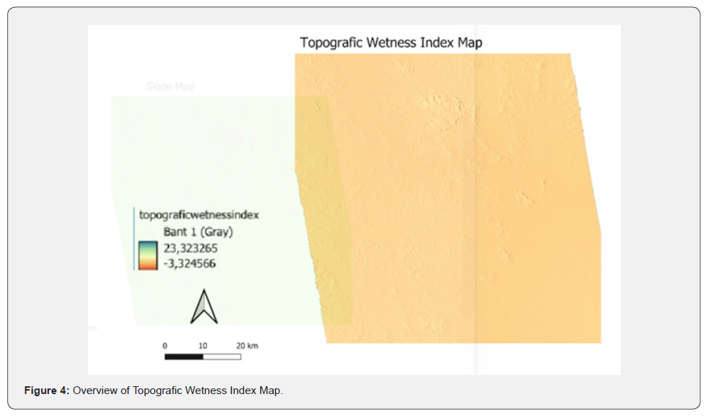 The Topographic Wetness Index (TWI) plays a vital role in drought susceptibility assessments by indicating the spatial variation of soil moisture influenced by terrain attributes. It identifies areas where surface water is likely to accumulate, based on factors such as upslope contributing area and slope gradient [11]. Higher TWI values correspond to locations with greater potential for water retention, suggesting lower susceptibility to drought due to increased soil moisture availability [12]. In contrast, low TWI areas typically experience rapid runoff and limited water storage, making them more prone to drought impacts. As a result, integrating TWI into geospatial drought models enhances the understanding of terrain-driven moisture patterns and improves the accuracy of regional drought risk evaluations. The Topographic Wetness Index (TWI) map of the study area is presented in Figure 4.