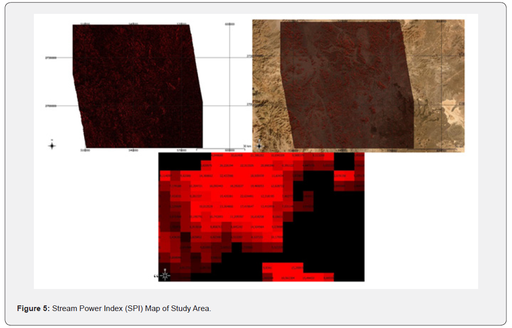 The Stream Power Index (SPI) is a key topographic indicator used to assess potential erosive power of surface runoff and its influence on landscape processes. In the context of drought susceptibility analysis, SPI is particularly valuable because it reflects the potential of concentrated flow to transport water and sediments, which directly influences soil moisture distribution and the hydrological connectivity of a watershed [13]. Areas with high SPI values typically indicate zones where runoff energy is stronger, often associated with stream channels or steep slopes, while low SPI values suggest flat or divergent areas with limited flow accumulation (Figure 5).