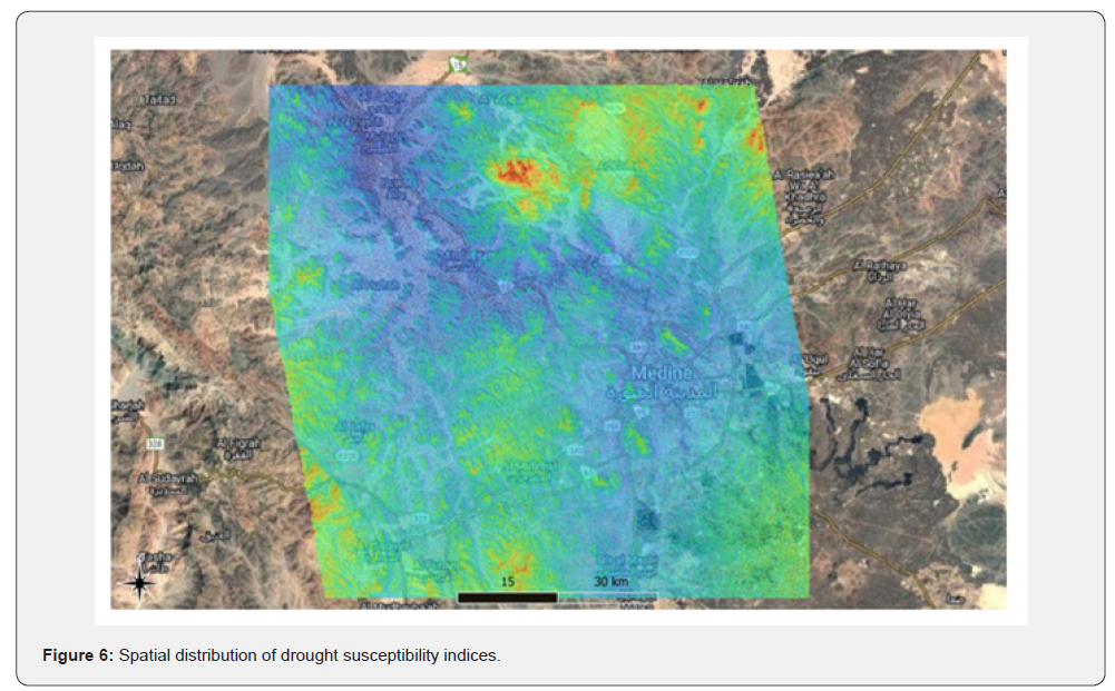The integrated analysis of topographic indices derived from ALOS PALSAR DEM and climatic parameters revealed distinct spatial patterns of drought susceptibility across the Medina region (Figure 4). Areas with low elevation (<250 m ASL) and gentle slopes (<5°) showed significantly higher vulnerability (p < 0.01), likely due to poor water retention and increased evaporative losses [5,17]. In contrast, elevated volcanic terrains (>800 m ASL) and steep slopes (>15°) demonstrated lower susceptibility, influenced by orographic precipitation and reduced evaporative stress.
